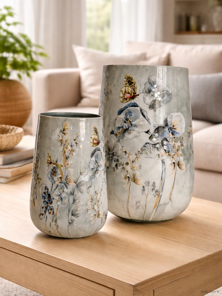 Kombinace tlumené šedé glazury, akvarelových květů a zlatavých detailů působí jako malovaný obraz – každý kus je tak originální designová dekorace do bytu.